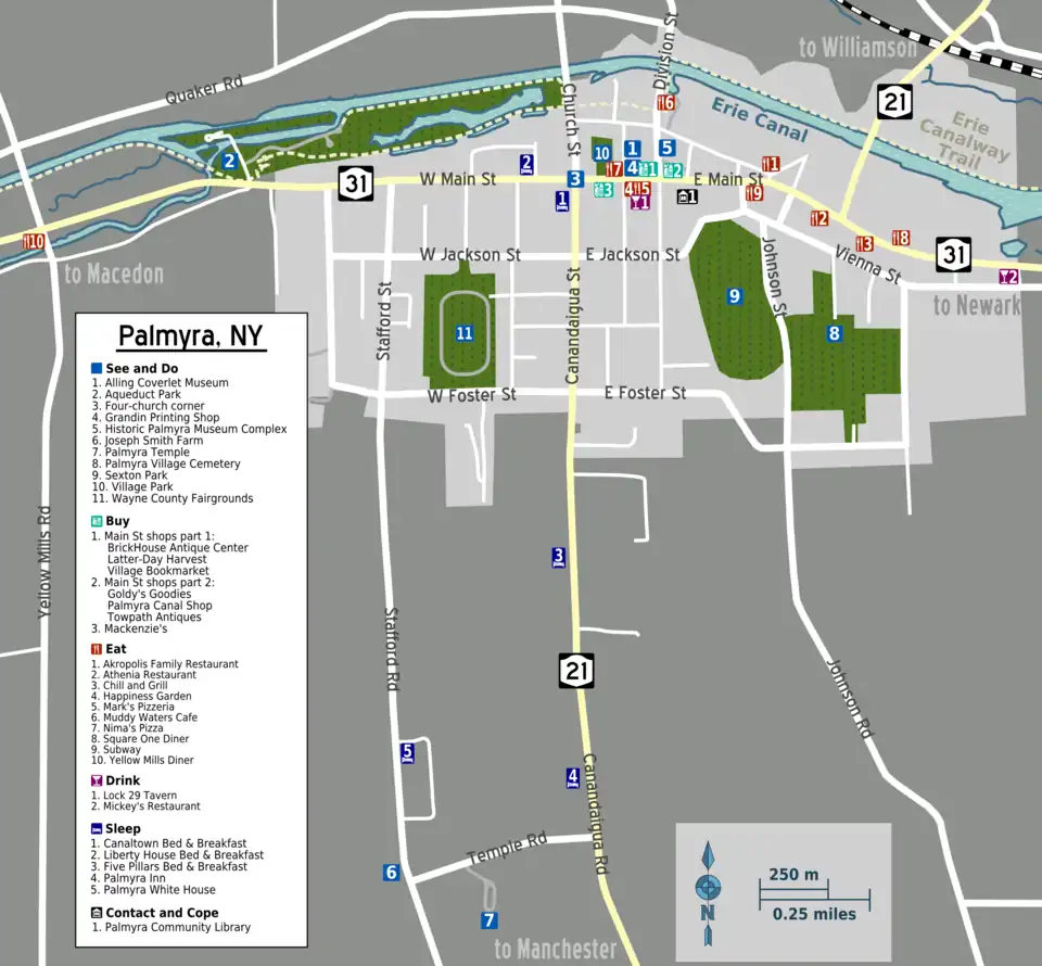 Palmyra is a village and surrounding town in the Finger Lakes region of New York. In the nineteenth century, it was a center for religious revivalism, but today it's one of the most-visited villages along the Erie Canal. Palmyra is the birthplace of the Church of Jesus Christ of Latter-Day Saints (also known as Mormonism) and claims to be the only community in the U.S. that has a four-corner intersection with a church at each one.