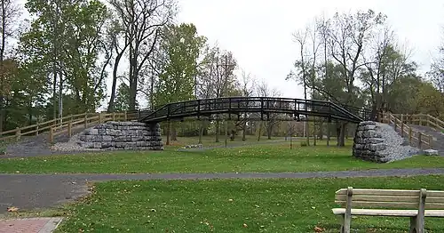 - Aqueduct Park (Rt 31 west to village line). 9AM-9PM. So named due to the still-standing aqueduct that carried the original Erie Canal—Clinton's Ditch—over "Mud Creek" (part of Ganargua Creek), Aqueduct Park is a treasure trove for Canal buffs. For starters, the aqueduct itself is quite a sight. Modern Lock 29 is also here, for those who like to watch boats lock up and down. There's a man-made waterfall where the modern canal spills over into the creek. Also here is the historic Aldrich Change Bridge; though it no longer crosses the canal, it was built when the original canal was widened in 1840 (the widened canal allowed no room for the south-bank towpath through the village of Palmyra, so the bridge was needed for the mules to change sides).