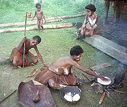 The food is largely devoid of spices. A typical way of cooking is a Mumu, an underground oven in which meat and vegetables, such as Kaukau (sweet potatoes), are cooked. In just about every meal, there is rice and another form of starch.