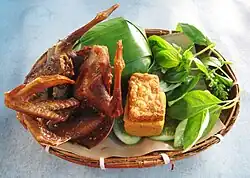 A typical Sundanese dish is nasi timbel, with steamed rice wrapped in a banana leaf, served with fried or grilled chicken, duck, or pigeon, tofu and tempeh, fresh vegetables, and sambal (chilli sauce). The city of Bandung is also known for soto Bandung (clear beef soup with soybeans) and siomay Bandung (also known as baso tahu, steamed dumplings served with spicy peanut sauce).