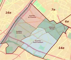 The 15th arrondissement is further broken up administratively into four quartiers: Grenelle, Necker, Saint-Lambert and Javel.