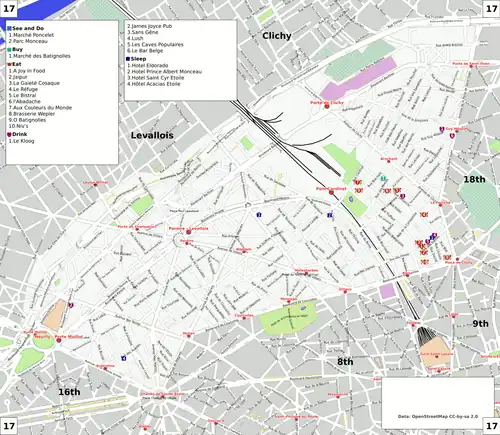 Hotels and other accommodation facilities in the 17th are mostly to be found clustered at the extremities of the arrondissement, near the attractions - the Place de l'Étoile the Palais du Congress and Place de Clichy (Montmartre). Those provide reasonable connections to the rest of Paris, especially Place de l'Étoile. While cheaper accommodation can be found deeper into the 17th, do make sure that it has effective transportation connections you will need to visit your points of interest.