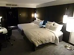 - 🌍 Le Méridien Etoile, 81, boulevard Gouvion Saint Cyr (metro/RER Porte Maillot), ☏ +33 1 40 68 34 34. The very first Le Meridien in the world, built in 1972 to cater for Air France passengers arriving on the newly-acquired widebody jets. Behind the distinctive 1970s facade are updated rooms and common areas with contemporary design and facilities. The hotel faces the Palais du Congres and caters mostly for business travellers. This is the largest hotel by room count in Paris, with 1,025 rooms of various types. The less expensive Classic and Deluxe rooms have more dated decor, the Urban and Executive rooms have been thoroughly updated to 21st century standards.