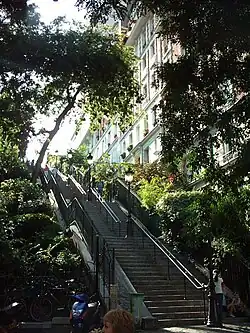 - Abbesses The station is fairly high up the slope of the hill, and the line is fairly deep underground, so getting up and down is part of the fun either in a seven-storey spiral staircase decorated from top to bottom with murals by local amateur painters, or in one of two high-capacity modern lifts. If you have time and good knees the choice is clear.