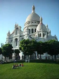 - 🌍 Sacré-Cœur (La Basilique du Sacré Coeur de Montmartre) (Anvers 2 or Abbesses 12 , then climb the stairs on Rue Foyatier or take the funicular to the top of the hill). Daily, 06:00-23:00. This wedding cake-white church rises visibly above the north part of Paris. The striking building, with its towers and white onion dome (83 m high), was built between 1875-1914 on the birthplace of La Commune, officially as an act of penitence for the sins committed during the civil war in which thousands of Communards were executed, as well as for the previous bloodshed of the 1870 Franco-Prussian war. A number of prominent businessmen put up the money, and a dizzying combination of architects worked to put together the mock Romano-Byzantine extravaganza. Consecration followed in 1919. The view over Paris from the dome and from the square before it (200 m above sea level) is unsurpassed, apart from that enjoyed at the Eiffel Tower (50 km on a clear day). For the athletic traveller there are stairs from several directions to the top of the hill; otherwise there is also a funicular which runs every few minutes during the daytime from Place St. Pierre. Follow the signs that say "Funiculaire De Montmartre". Beware that the guards don't like it if they catch you taking pictures inside and will even yell "No photo!" and chase you down if they see you with a camera. Be warned: along the lower steps leading up to church, groups of mostly young African men gather and reach toward you with a small string, offering to loop it round your finger. In case it happens, pull back your hand, brush them off and move on. They might claim that "This is for the church."
