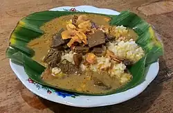 - Nasi gandul, Pati's specialty dish of rice mixed with beef soup. It is served on a banana leaf plate.