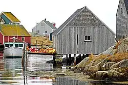 Peggy's Cove is a hamlet and popular tourist spot in Nova Scotia. It is both bleak and picturesque with its historic and still-used lighthouse standing watch over the village and the granite rocks and cliffs.