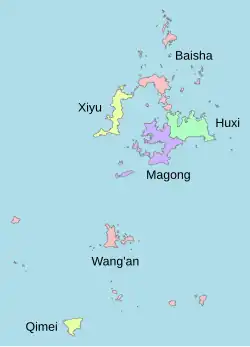 Located to the west of the main island of Taiwan, is composed of 90 islets; most are uninhabited. There are 7 administrative districts, 1 city and 6 townships. The city is Magong (馬公) and the townships are Huxi (湖西), Baisha (白沙), Xiyu (西嶼), Qimei (七美), Wang'an (望安). Magong City, Huxi, Baishia and Xiyu are on Penghu's main islands; Qimei and Wang'an both are isolated islets in the southern sea.