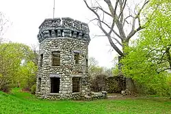 - π Gibbet Hill Castle (Bancroft's castle) (Park off Lowell Rd. just east of the Gibbet Hill Grill). Built in 1906 and ruined in 1932, Bancroft's castle is an impressive structure with a tower and overgrown stone walls. Public access is free and unrestricted, although it can be hard to find parking on nice days. There are also some good views of the area from the top of Gibbet Hill. Note that despite how it looks on the map, you cannot drive directly to the castle; park on the north side of Lowell Rd. near the stone pillars that mark the trailhead, and there is a short but steep trail up to the castle.