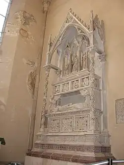 - π Perugia Cathedral (Cattedrale di San Lorenzo). This has an unusual layout for Italian churches in that the side rather than the front entrance faces the main square. There have been many churches on the site: this one was last worked on around 1490. But finished it was not, as can be clearly seen from the unfinished faΓ§ade facing the square. This side includes the Loggia di Braccio, an early Renaissance structure. Under it a section of Roman wall and the basement of the old bell tower can be seen. Also found here is the 1264 Pietra della Giustizia ("Justice Stone") with which Perugia announced that it had repaid its public debt, a not inconsiderable feat. Also noteworthy is the external pulpit from which Saint Bernardine of Siena, a virulently anti-homosexual priest, would preach.