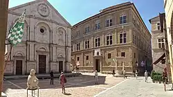 - Palazzo Comunale: Across from the church is the town hall, or Palazzo Comunale. When Corsigniano was given the status of an official city, a Palazzo was required that would be in keeping with the city's new urban position. It has a brick bell tower that is shorter than its counterpart at the cathedral, to symbolize the superior power of the church. The set-back addition to the tower dates from 1599. It is likely that Bernardo Rossellino designed the Palazzo Comunale to be a free-standing civic mediator between the religious space before the cathedral and secular market square to its rear.