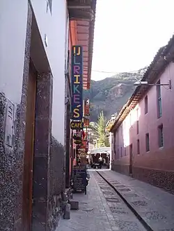 The town is located in the district of Pisac, province of Calca at the southern end of the Sacred Valley at an altitude of 2,972 m (9,751 ft), 32 km (20 miles) northeast of Cusco. The town straddles the Vilcanota River with most of the settlement on its right bank, where it is laid out in a grid pattern, centred around the Plaza Constitución (formerly the Plaza de Almas).