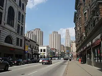 From Downtown, primary streets you can take to get into the district are the Boulevard of the Allies, Forbes Avenue (one-way west), Centre Avenue, or Bigelow Boulevard. Fifth Avenue runs parallel to Forbes Avenue, but is a one-way street westbound (towards Downtown) between Oakland and Downtown. On the east side of Oakland it is a two-way street and one of the primary routes used to reach Shadyside.