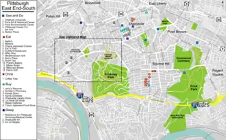 - 🌍 Frick Park, to the east of Squirrel Hill. A wonderful wooded park (and Pittsburgh's largest) with a network of trails ideal for walking the dog or bicycling. There are several entrances to the park, the main ones being at Reynolds St and Homewood Ave (across the street from the Frick Art & Historical Center) at the north end of the park, Beechwood Blvd just south of Forbes Ave and at Nicholson St on the west side of the park, and at Forbes and Braddock Avenues on the east side of the park. From any of the entrances you'll head down shady, wooded slopes to a small valley which runs south to the Nine Mile Run Watershed, where a small stream flows into the Monongahela River. The 🌍 Frick Environmental Center, off of Beechwood Blvd just south of Forbes Avenue, hosts nature programs for children and has a small pond and a woodland area for wildlife viewing. There is also a pair of excellent playgrounds in the park, one at Beechwood Blvd and Nicholson St and the other at Forbes and Braddock Avenues, along with softball fields and tennis courts.