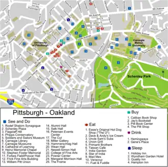 - 🌍 Primanti Bros., 3803 Forbes Ave, ☏ +1 412 621-4444. Su-W 10AM-midnight, Th-Sa 10AM-3AM. A local chain, Primantis offers the quintessential Pittsburgh sandwich. No trip to Pittsburgh is complete without experiencing one of their coleslaw and french fry topped extravaganzas. Profiled in numerous national programs and articles, if you only have time to eat at a Primantis once during your trip to Pittsburgh, than Oakland has this location ready for you.