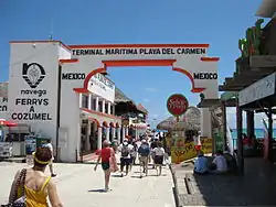 Take a taxi for the 2.5 km to the Cozumel ferry terminal. From there take a boat to the center of Playa de Carmen for US$13 (Feb 2022). More details are stated further below in "By boat". In front of the nearby Terminal Turistica are taxis which bring you to your accommodation.
