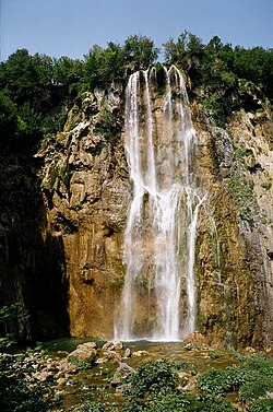 A chain of lakes below Kozjak lake, carved out in a canyon. Veliki Slap, the largest waterfall in the park, can be found near Kaluderovac lake.