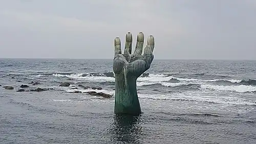 - The Hands of Harmony (take bus #200 outside of the Intercity Bus Terminal; transfer buses at 구룡포 (Guryongpo) and head for 호미곶 (Homigot)). Well beyond POSCO lies a small fishing village called Homigot. While the beaches in this town are too rocky to be considered viable for swimming, there is a work of art worth seeing; The Hands of Living Mutually or Hands of Harmony. This is a massive bronze sculpture of a hand stretching up from the water in a small cove. A second bronze hand of equal proportion stretches up from dry land on the other side of Homigot Sunrise Square. The hand in the water is worth seeing, particularly at sunrise. This particular cove's claim to fame is that it is the farthest point east in Korea (also referred to as the Tiger's Tail) so the sun rises here first. This charming place is a bit of an obscure tourist trap. Amateur photographers from all over the country come to shoot pictures of the sun rising through the fingers of the hand. Some bring expensive state-of-the-art equipment whilst many will merely whip out their cellphones and start shooting. This can be a crowded shoving match over the rocks and ocean. Some will even venture waist-deep into the water, holding their cellphones high, amidst squawking seagulls, to get a better shot of the bird-soiled sculpture. New Year's Eve is presumably the best time to visit the monument as there are fireworks and festivities that run until dawn (which is shortly after 07:30). The sight is also popular in the summer months, when temperatures are more agreeable. While there are hotels within an easy walk, some opt to sleep out on the square with a friend, a sleeping bag, some mosquito spray and a couple bottles of soju. The sun rises early in the summer (shortly after 05:00 in late June). Near the sculptures are a lighthouse and museum along with numerous tourist shops, seafood restaurants, peddler tents and the likes. The local-owned tourist shops can be immensely helpful when finding a place to stay or the next bus out. There are traditional squat toilets in the public restrooms nearest The Hands. Western-style toilets can be found at the restrooms outside the lighthouse museum nearby.