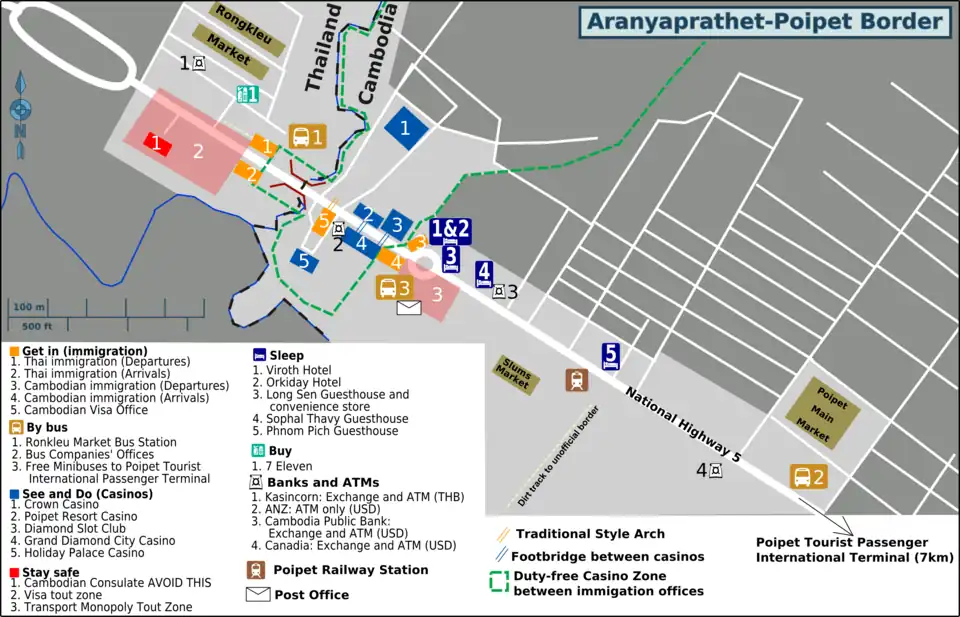 This one is common. Any tuk-tuk driver from Aranyaprathet will take you to the Cambodian Consulate first. Visas here are overpriced (1,000-1,400 baht vs. US$30 if obtained after Thai immigration). Do not waste your time here: just say "have visa" loud and clear, even if you don't, and he will not persist in trying to scam you. Even if you make it past the consulate, you're still in the visa tout zone (see map). A group of "visa officials" with fake laminated badges will have a go at sending you back to the consulate for an expensive visa. They are criminals. Ignore them and go to the Thai immigration office, which is to the left of the main road. Whatever happens, only get a Cambodian visa once you have been stamped out of Thailand and have walked across the bridge to Cambodia. |
