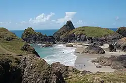 - π Gunwalloe Cove with its medieval church and seasonal lifeguarded beach (Church Cove).