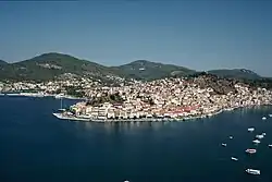 Poros (Greek: Πόρος) is a green island situated in the Saronic Gulf, 59 km (32 nautical miles) from the Piraeus harbour of Athens. It has an area of 33 km², a shoreline of 42 km, and a population of about 3,650.