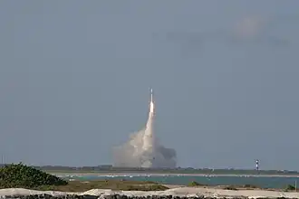 Cape Canaveral is part of a region known as the "Space Coast", since all of the manned United States spacecraft are launched from the Space Coast. The city sits at the northern end of a barrier island on the Atlantic coast of Florida, south of the geographical cape. Falcon 9 (pictured above), the first rocket to land its first stage, takes off from the Kennedy Space Center. The visitors' complex of the space center is found across a waterway, to the west.