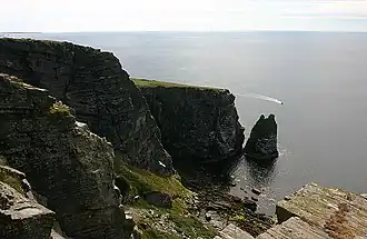 - π Spanish Head is a breezy headland with 300-ft cliffs and views west to the Calf: access by footpath. The name is from Manx speeiney meaning splitting or peeling, like the terrain of the Chasms. Inevitably this has become garbled into "Spanish", with a bogus legend of a Spanish Armada shipwreck. They were never anywhere near: the retreating Armada knew the Irish Sea was bristling with English warships, and instead tried to limp home west of Ireland.