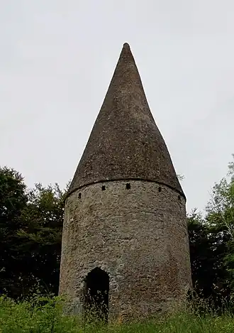 - 🌍 Lea Castle is a ruin along R420 four km east of town. It was built in fits and starts over the 13th century, replacing a timber and earthwork structure, and in its pomp was a mighty four-towered donjon or keep with an inner and outer moat and bawn wall. But it was wrecked on multiple occasions, and was already in a sorry state when Cromwell's troops came by in 1650, and wrecked it some more just to keep their hands in. One last tenant lived here until 1737. The ruin is overgrown and unsafe, so it's closed to the public, and work is under way to try to stabilise what remains.