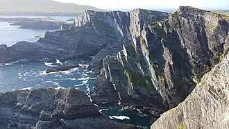 - π Kerry Cliffs line the coast south of Portmagee. Reach them along Skellig Ring, the narrow lane round this tip of the peninsula. The lane then zags over the ridge to St Finian's Bay, with the ruined Glen Church, then cuts inland past Coom Wedge Tomb (resembling a petrified ottoman sofa) to Ballinskelligs.