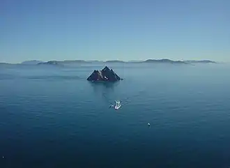 - π Skellig Michael is visible away out in the Atlantic southwest in the general direction of Cuba, with the lower Little Skellig lying before it.