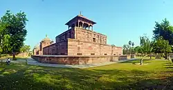 - 🌍 Nithar Begum's Tomb. Nithar Begum was Khurso Mirza's sister and daughter of Shah Begum. The tomb came up in 1624 - 25 and is the last of the three great tombs of Khusro bagh. It is also the most elaborate of the three tombs. A two-story structure built on a raised plinth, the material used is primarily red sandstone. The tomb chamber is approached through an elaborate doorway carved within the plinth that leads to the lower level (meant to house the actual grave). The two tired upper part is crowned with a massive dome topped with a beautiful finial. The dome is flanked with four chatris in the four corners and the four corners of the structure houses slender minerates. The interior houses finest frescoes of the Mughal period complete with elaborately painted stars in concentric circles. A series of inscriptions runns throughout the inner walls of the tomb.