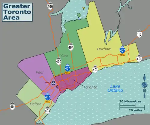 Greater Toronto consists of the City of Toronto and four surrounding regional municipalities: Durham, Halton, Peel, and York; which in total contain 25 urban, suburban and rural municipalities.