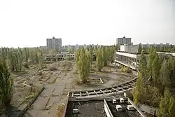 *As of 2019, entry into all buildings in Pripyat is banned, because as the buildings age they become structurally unstable, and the government and most tour groups would rather not deal with the results of a tour group being caught in a cave-in. Experienced guides in some tours, however, know which buildings are "safe" (stable enough) to enter, and will take groups in for photos. If they do, only go where they go as they know what parts of the buildings are stable and what parts aren't. Generally this is limited to the sports facility (the pool) and the roof of an apartment tower. Most of the buildings were 'cleaned' of their radiation during the liquidation process and now contain amounts similar to downtown Kyiv, so the dangers come not from radiation but from the buildings themselves. Places like the amusement park and the main square are still accessible because they don't involve entering any buildings.
