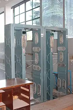 When leaving the Zone of Alienation, the area within 10 km of the exploded reactor, every vehicle will be checked with a radiation detector at a 🌍 checkpoint. All passengers need to leave the vehicle and must pass through a detection portal to check for any radioactive contamination on hands, body, clothes, or shoes. The detection portals are completely automated: simply step in sideways, placing feet on the bottom detectors and hands on the detection plates on either side of the portal. The barrier will unlock after a few seconds if no contamination is detected. If radioactive contamination is detected on clothes or shoes, they must be taken off and washed off. If contamination can't be removed then these clothes must be left behind. If contamination is detected on your body, you will be asked to take a shower before being rechecked by the radiation detection portal.