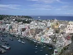 The landmarks of Procida reflect typical Mediterranean pastel colours.