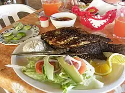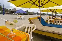 - 🌍 Restaurante de Hotel Santa Fe, Calle Del Morro s/n (in the Hotel Santa Fe), ☏ +52 800 712 7057, info@hotelsantafe.com.mx. Daily 07:30-23:00. Set beneath a palapa with great ocean views, this places serves not only Mexican favorites but also an extensive listing of vegetarian dishes. M$100-150 mains (Sept 2014).