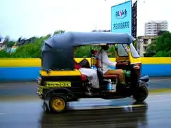 An auto rickshaw, or auto or rickshaw or tempo in popular parlance, is a three wheeled vehicle for hire. They typically have no doors or seat belts. Generally yellow or green in colour and have a black or green canopy on the top. An auto rickshaw is generally characterized by a tin/iron body resting on three small wheels, a small cabin for the driver in the front and seating for three in the rear. Hiring an auto often involves bargaining with the driver.