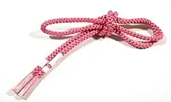 - Obijime – a cord worn around the middle of the obi itself, it can hold the obi knot in place, but sometimes is simply there for decoration. Most obijime are woven cords, though some – known as maruguke – resemble padded tubes, and are worn with more formal kimono outfits.