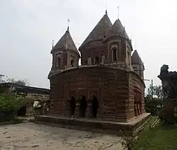 - 🌍 Boro Annik Mandir. The east facing temple follows a mixed style of Bengal temple architecture. The central part follows the do chala style and is flanked on both sides by two char chala structures. The front faced of the do chala section has a triple-arched entrance. The two char chala sections have a single arched entrance. The front face of the temple has elaborate terracotta ornamentation.