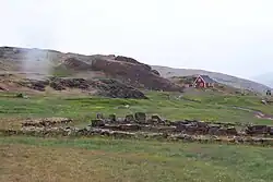 Rocks remain of Brattahlíð, the farmstead of Erik the Red. His son Leif Eriksson would lead a Viking expedition to Newfoundland as probably the first Europeans to set foot in North America.