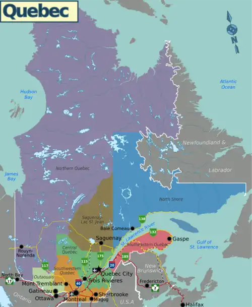 • Leave the province to Labrador. Follow the Trans-Labrador Highway from Forteau to Happy Valley-Goose Bay, then head west on the Trans-Labrador Highway through Labrador City. Cross back into Québec at Fermont. A primitive gravel highway (Quebec Route 389) leads south to eventually reach Baie-Comeau, a long journey on poor quality roads with few services. If 410 km is posted as the distance to the next filling station in this section of Labrador, the newfies are not joking.
