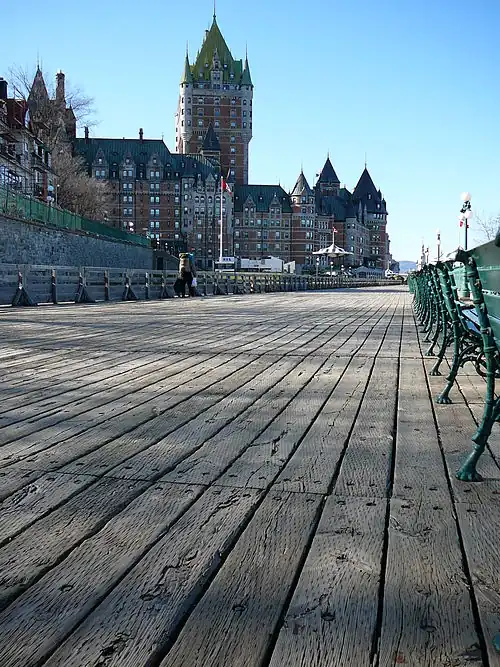 - 🌍 Château Frontenac (Fairmont Le Château Frontenac), 1 rue des Carrieres, ☏ +1 418 692-3861. One of Canadian Pacific Railway's grand old hotels, this castle-like building dominates the Quebec skyline and claims, with some justification, to be the most photographed hotel in North America. The location next to the funicular connecting Haute-Ville and Basse-Ville is as convenient as it gets, but expect tour groups marching through the lobby at five-minute intervals. From $300, but offers CAA/AAA discounts.