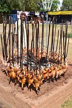 In the old bazaars are old tea-shops, which are the local social clubs. There are also many popular eating houses offering different types of delicacies. Among the popular delicacies is Sajji (leg of lamb), which is tender and is not very spicy. It is a whole leg of lamb marinated in local herbs and spices and barbecued beside an open fire. It is very popular among the locals and is offered with great insistence to the guests. The Pathan tribesmen of the valley also enjoy Landii (whole lamb) and Khandi Kebab. Landhi is a whole lamb which is dried in shade and kept for the winters. Kebab shops are very popular, the best being Lal Kebab and Cafe Baldia. They serve Pakistani and Continental food. The Chinese restaurant that is one of the oldest in town is Cafe China. Some of the finest mutton in the country is raised around Quetta. It has a delicious smell which can be sampled in the 'Pualao that most of the eating houses.