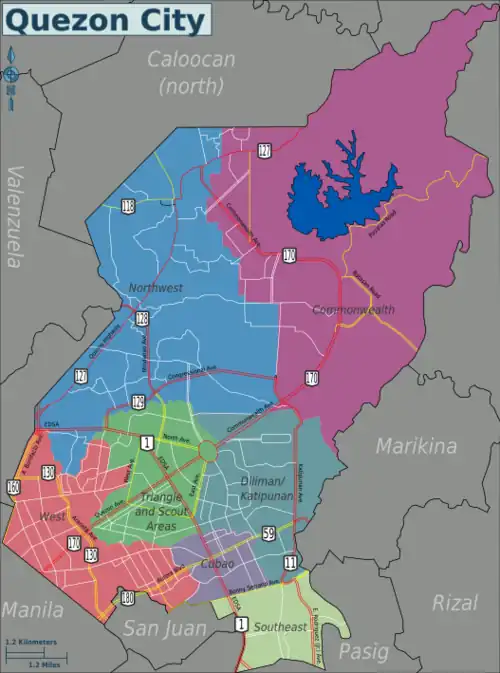 The city was named after former Philippine president Manuel Luis Quezon y Molina. Quezon City was the country's capital from 1946 until 1972, when the seat of government was returned to neighboring Manila. Quezon City consists of five districts. Administratively, the city is divided into 127 barangays that are generally used in addresses and for official purposes; in addition, there are also a number of traditional areas, like Cubao, Diliman, New Manila, etc., that have since been subdivided but are still commonly used in addresses and when giving directions. For the purposes of this guide, these can be broadly grouped into seven districts.