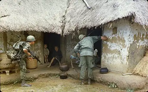 American soldiers searching for Viet Cong in a home in the Quy Nhơn countryside, 1966. The "pacification" operations led to over 130,000 locals fleeing for shelter in refugee camps.