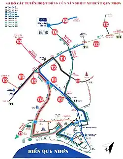 See more information on the Quy Nhon tourism bus website and the local government bus summary. Also, at the two following central bus stops there are overview maps and lists with the bus lines available. Except for T4 and T6, which run regularly between 05:30 and 17:30, the schedule of the other bus routes is unknown.