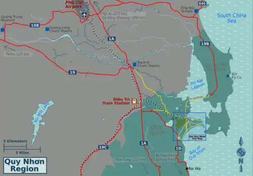 The centre of Quy Nhơn lies on a small peninsula which juts out like a dragon's head from the mainland into the South China Sea. Trần Hưng Đạo street is the most convenient road running east to west, stretching from the far eastern tip through the city centre to connect to Highway 1A and the train station, airport and Bình Định countryside in the northwest. Most sites of interest to tourists are to the south of Trần Hưng Đạo; to the north are residential areas, fishing-related industries and industrial port zones.