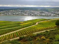 The town incorporates the village of Assmannshausen, also on the Rhine but on the other side of a bend in the river, and is also known as Rüdesheim am Rhein to distinguish it from the smaller nearby town of Rüdesheim an der Nahe.