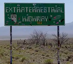 • Extraterrestrial Highway signs. The Route 375 signs, more commonly known as the Extraterrestrial Highway signs are notable for the marks placed by tourists, the UFO/F-117 Nighthawk symbols and that they don't use the Highway Gothic font for the main text. The Extraterrestrial Highway also features occasional alien-related graffiti, like a boulder that says "Let's Get Abducted".