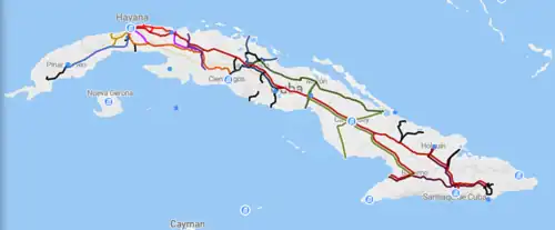 The main train line in the country runs between Havana and Santiago de Cuba, with major stops at Santa Clara and Camagüey. Trains also run to other cities such as Cienfuegos, Manzanillo, Morón, Sancti Spiritus, and Pinar del Rio.